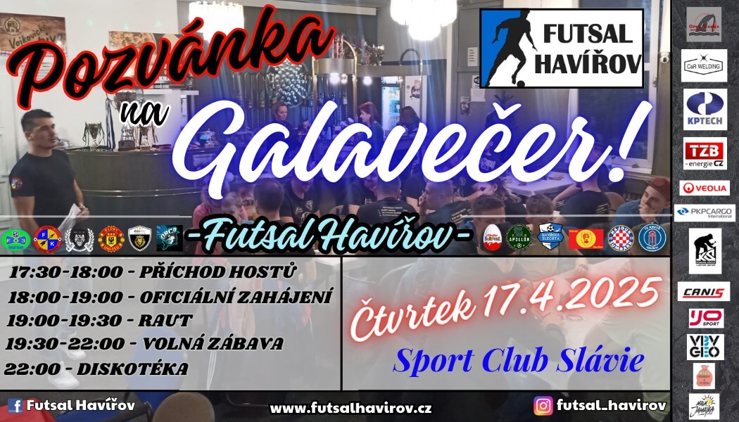Ve čtvrtek 17. 4. 2025 od 17:30 hodin se bude konat v restauračním zařízení Sport Club Slávie galavečer Futsalu Havířov.